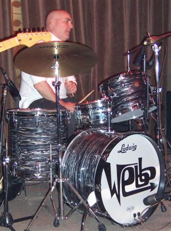 Caption: Jimmy Lester behind that spiffy new-design drumset.