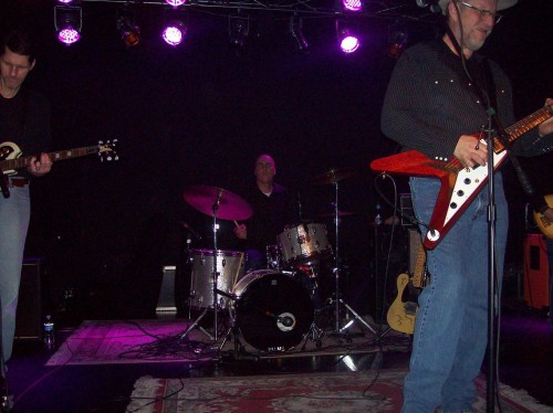 Caption: Bob, Jimmy, Webb, and Webb's beautiful Flying V