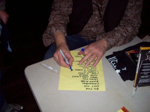 Caption: Webb signing the setlist for Hunter